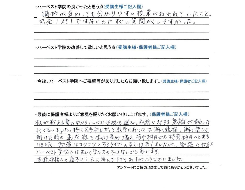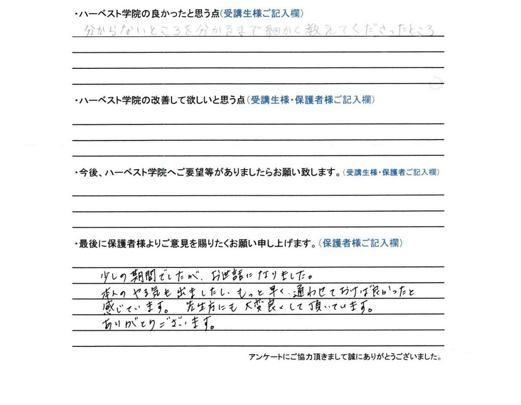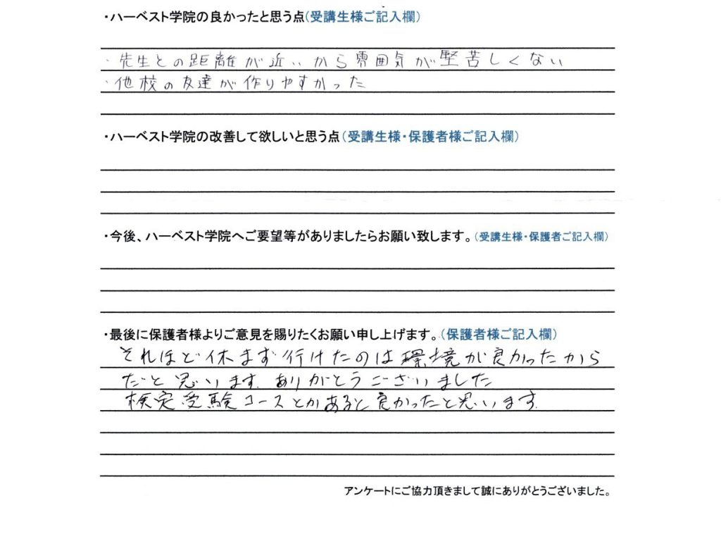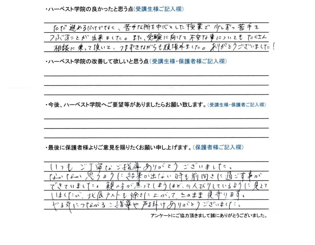 保護者さまからの声 生徒さまの卒業時に、保護者様からいただいた率直なお声を掲載させていただいております。いただいたご意見は参考にし、さらによりよい授業やサービスを提供できるよう努めています。 ※氏名についてはプライバシー保護の観点から、一部あるいは全てを仮名に変更した上で掲載させていただいております。何卒ご了承のほどお願い申し上げます。 富塚 玲奈 様 片山 良美 様 亀田 洋子 様 花田 遥 様 赤塚 絵理子 様 小島 陽子 様 太田 江梨子 様 深谷 真由 様 次のページ 1 2 3 4 5