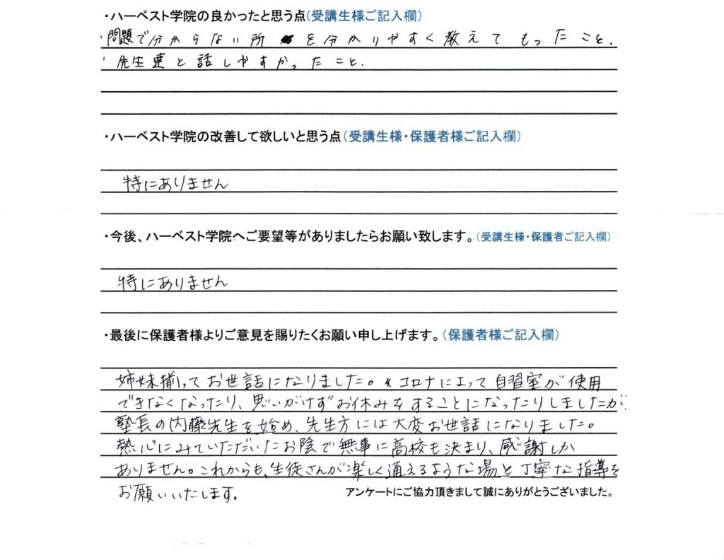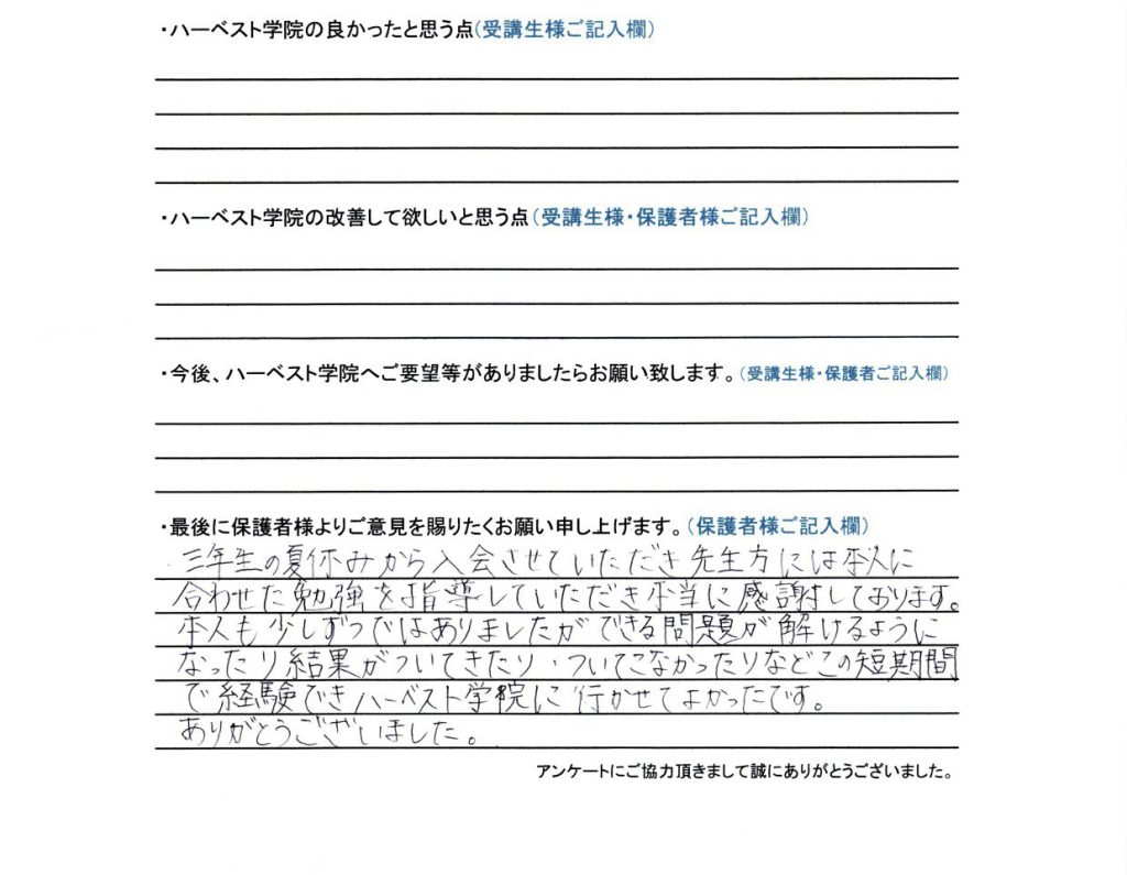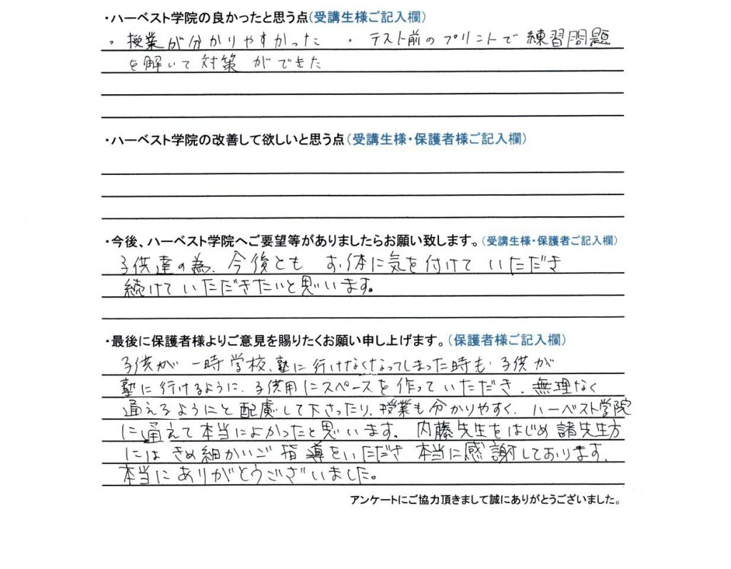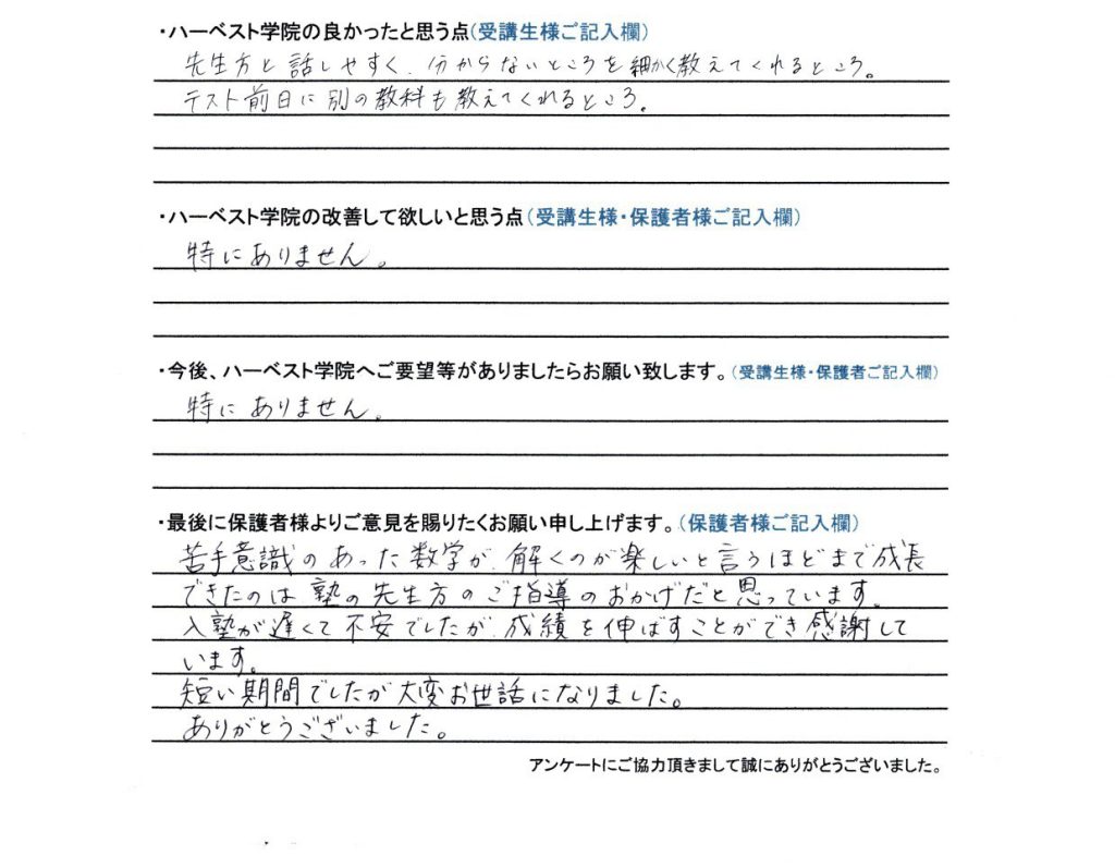 保護者さまからの声 生徒さまの卒業時に、保護者様からいただいた率直なお声を掲載させていただいております。いただいたご意見は参考にし、さらによりよい授業やサービスを提供できるよう努めています。 ※氏名についてはプライバシー保護の観点から、一部あるいは全てを仮名に変更した上で掲載させていただいております。何卒ご了承のほどお願い申し上げます。 富塚 玲奈 様 片山 良美 様 亀田 洋子 様 花田 遥 様 赤塚 絵理子 様 小島 陽子 様 太田 江梨子 様 深谷 真由 様 次のページ 1 2 3 4 5